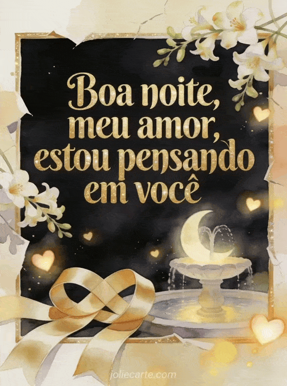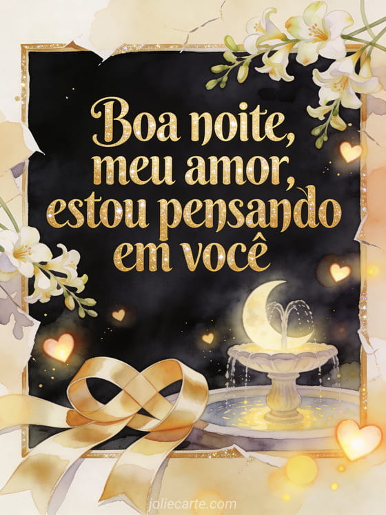 Compartilhe um cartão romântico de boa noite com fitas de cetim entrelaçadas junto a uma fonte ao luar, luzes de coração flutuantes e frésias. Veja também uma bela mensagem para desejar boa noite, uma mensagem para desejar boa noite à sua esposa ou uma mensagem para desejar boa noite à sua namorada.