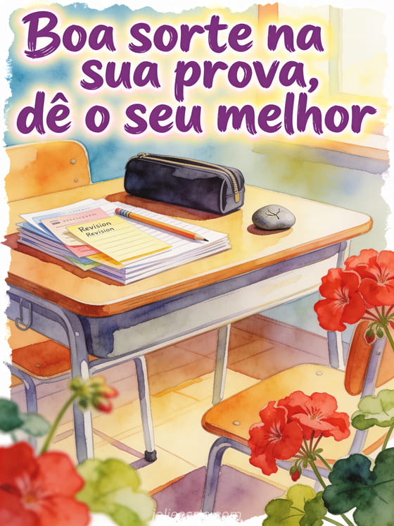 Deseje boa sorte na prova com uma mesa clara em aquarela, um estojo fechado, cartões de revisão, um seixo da sorte e flores vermelhas de gerânio. Você também pode compartilhar boa sorte para encontrar colegas melhores do que nós cartão, boa sorte gifs ou adeus e boa sorte cartão.
