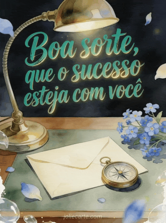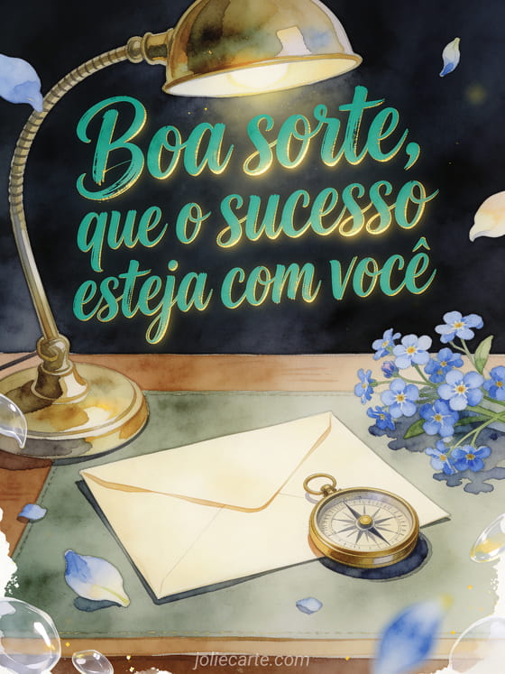 Envie uma mensagem encorajadora de boa sorte com uma mesa elegante, uma lâmpada de latão, um envelope selado, uma bússola e flores de miosótis. Veja também boa sorte gif animado, boa sorte imagem gif ou mensagem de boa sorte para prova.