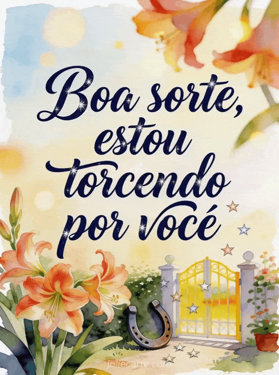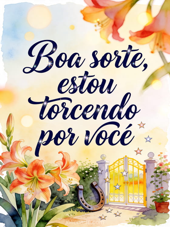 Envie uma mensagem carinhosa de boa sorte com letras azul-marinho, brilhos sutis, uma ferradura da sorte, flores de amarilis e confetes de estrelas perto de um portão de jardim iluminado. Você também pode compartilhar adeus e boa sorte texto, modelo cartão boa sorte ou boa sorte para o futuro.
