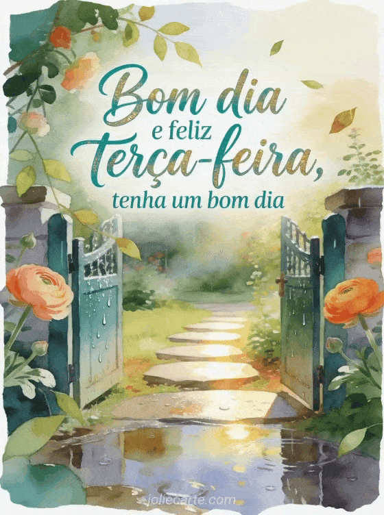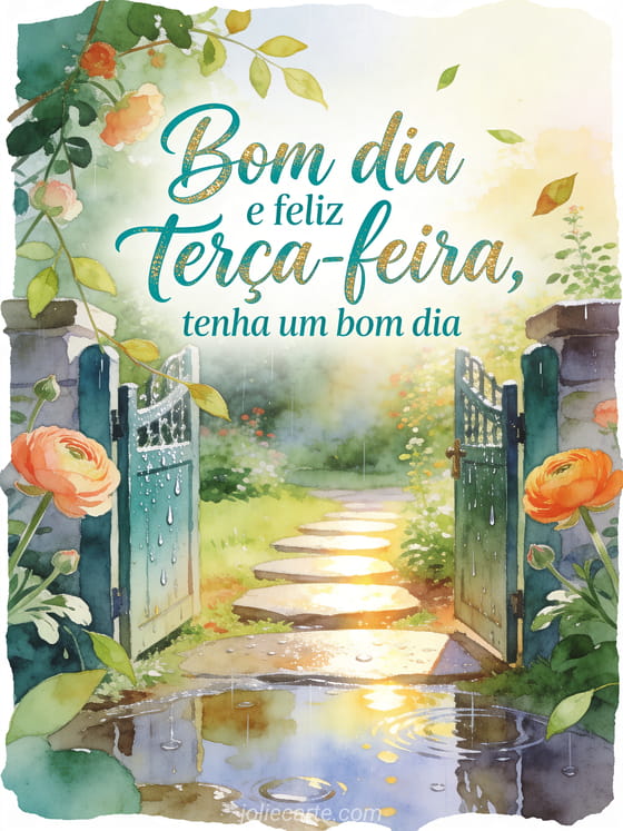 Compartilhe uma mensagem de bom dia e feliz terça-feira com um portão de jardim molhado pela chuva, pedras iluminadas pelo sol e flores de ranúnculo. Veja também feliz terça-feira ao sol gifs, um feliz terça-feira texto ou um texto para desejar uma feliz terça-feira.
