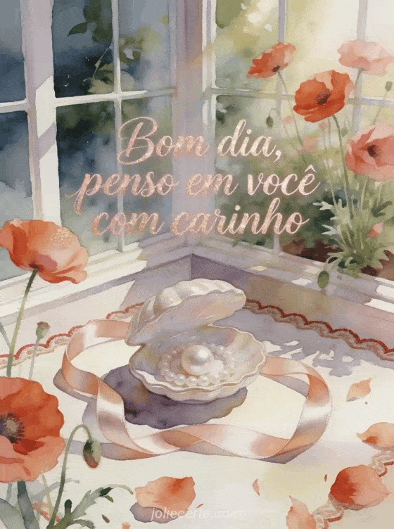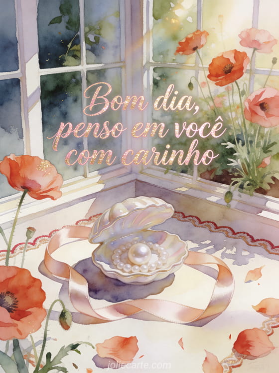 Envie uma mensagem poetico de bom dia para ela com letras rosadas delicadas em aquarela, papoulas, um pratinho de joias perolado e laços de fita acetinada em uma varanda iluminada. Veja também mensagem de bom dia para uma amiga, cartão floral de bom dia ou belo cartão virtual gratuito de bom dia.