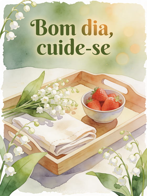 Envie uma mensagem de bom dia para ele com uma bandeja de café da manhã em aquarela, lírios-do-vale, morangos e linho dobrado. Este cartão terno é perfeito para dizer cuide-se com a calma da manhã, e você também pode ver bom dia tudo bem, um cartão virtual grátis bom dia ou bom dia ao seu namorado.