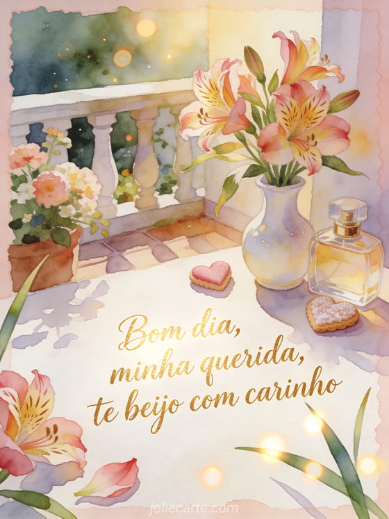 Envie um cartão romântico de bom dia com escrita framboesa em aquarela, um canto florido de pátio, alstroemérias, um frasco de perfume de porcelana e biscoitos de açúcar em forma de coração. Veja também uma mensagem bonita de bom dia, uma mensagem fofa de bom dia com carinho de manhã ou uma mensagem de bom dia para ela.