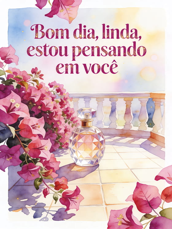 Envie uma mensagem romântica de bom dia para minha linda com letras elegantes em aquarela, um frasco de perfume e buganvílias luminosas. Veja também mensagem de bom dia amigável, mensagem fofa de bom dia ou manhã bom dia.