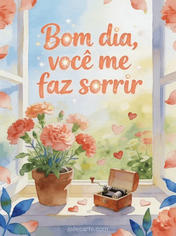 Envie uma mensagem alegre de bom dia para seu crush com letras coral em aquarela, cravos, uma pequena caixa de música e confete em forma de coração. Veja também mensagem de bom dia para minha linda, bom dia humor imagem ou bom dia gif animado.