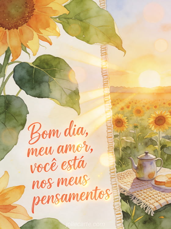 Envie uma mensagem de bom dia para sua esposa com um cartão radiante, cheio de calor do amanhecer, girassóis e ternura carinhosa. Você também pode compartilhar um bom dia gif, um bom dia humor gif ou uma mensagem de bom dia tocante.