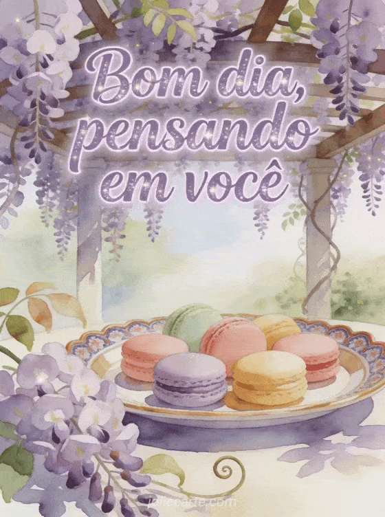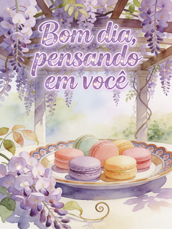 Envie um cartão amigável de bom dia com letras suaves em aquarela lavanda, uma pérgola coberta de glicínia, uma alegre bandeja de chá e macarons em tons pastel sob luz de primavera. Veja também um cartão floral de bom dia, um belo cartão virtual gratuito de bom dia ou cartões virtuais gratuitos de bom dia.