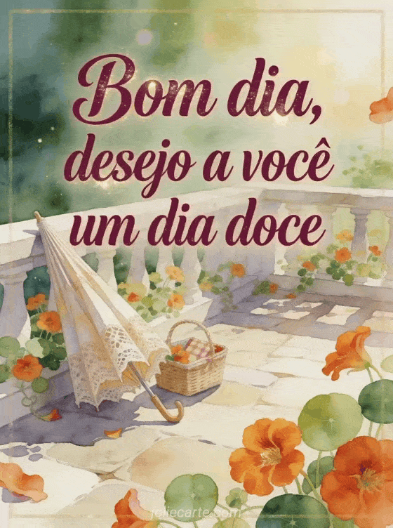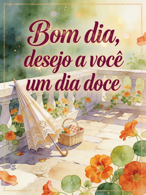 Envie uma mensagem de bom dia para uma mulher com uma cena refinada em aquarela em um terraço ensolarado, capuchinhas, um guarda-sol de renda dobrado e uma pequena cesta de piquenique. Compartilhe esta saudação delicada para desejar um dia doce, e veja também uma mensagem de bom dia para seu homem, um olá como vai você ou uma mensagem bom dia para o amor.