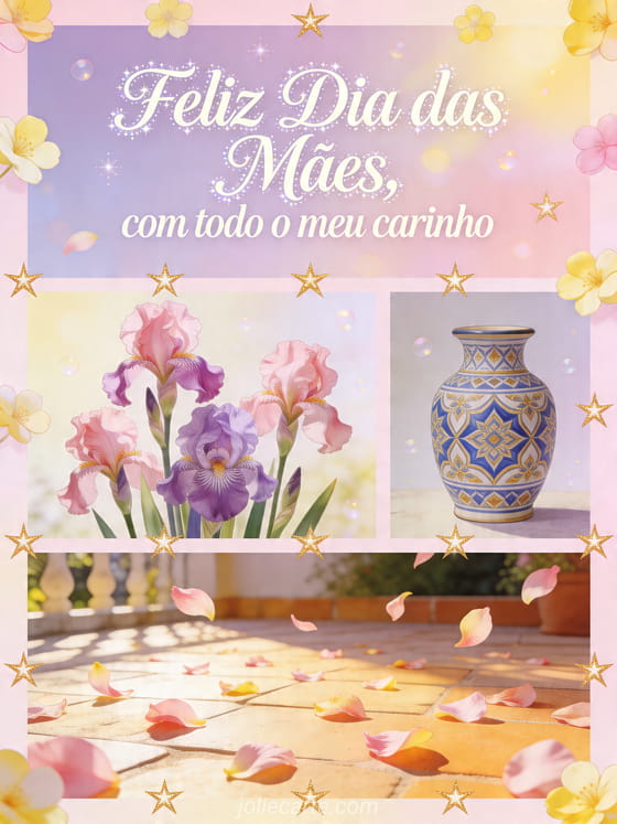 Compartilhe um cartão delicado de Dia das Mães em colagem de três painéis, com íris altas, um vaso de cerâmica estampado e pétalas sobre um terraço ensolarado. Veja também cartões do Dia das Mães, uma imagem do Dia das Mães ou um desenho para o Dia das Mães.