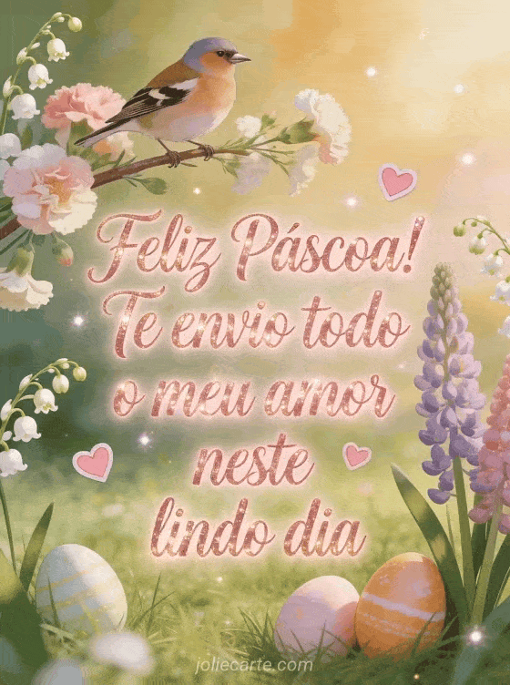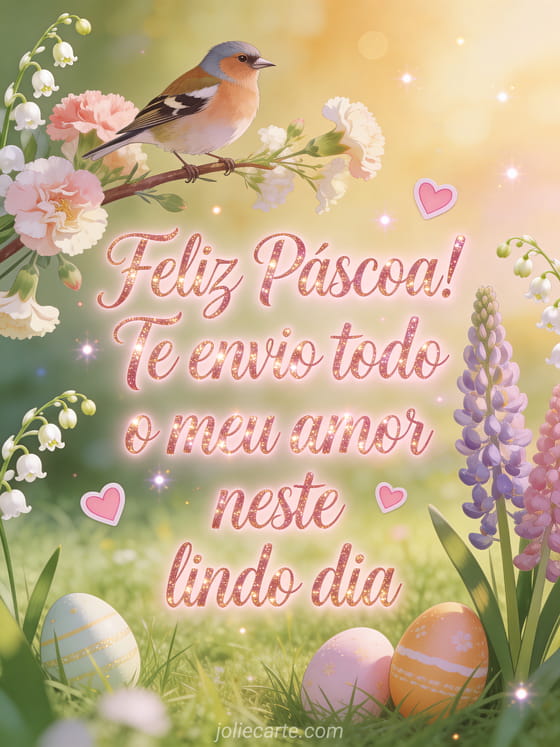 Envie esta linda mensagem de Pascoa para quem voce ama, com um dom-fafe pousado em um galho de cravos e tremocos, ovos de Pascoa aninhados na grama verde fresca e brilhos dourados. Uma ilustracao romantica e calorosa. Descubra tambem uma imagem de Pascoa gratis, um cartao de Pascoa para Facebook ou um cartao de Pascoa.