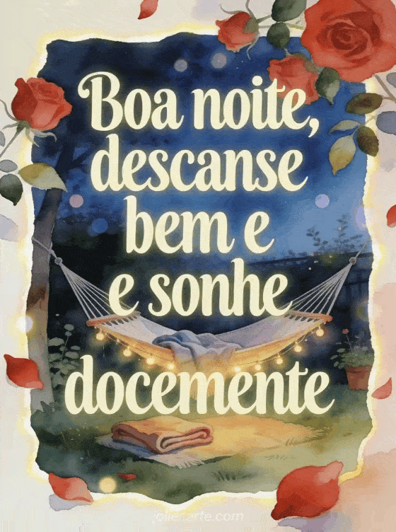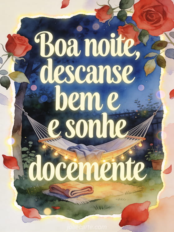 Envie uma mensagem carinhosa de boa noite com uma rede em um jardim tranquilo, luzes brilhantes e pétalas de rosa em primeiro plano. Veja também mensagem de boa noite para sua namorada, bonita mensagem de boa noite ou mensagem de boa noite para ela.