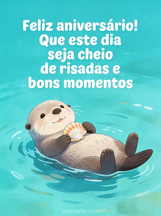 Compartilhe um cartão marinho e divertido de aniversário com uma lontra tranquila flutuando de costas em água turquesa, segurando uma concha entre as patas. Veja também um feliz aniversário feliz aniversário meu filho, um sms para desejar feliz aniversário ao meu filho ou um cartão de aniversário meu filho.