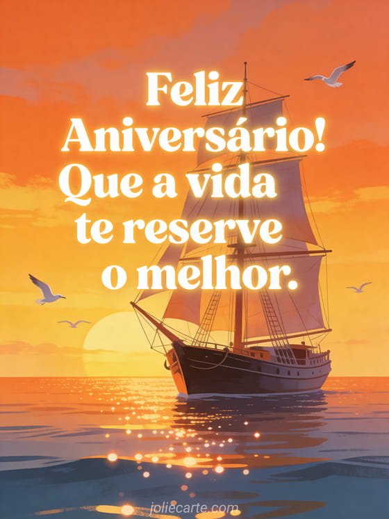 Deseje feliz aniversário com esta inspiradora mensagem: "Que a vida te reserve o melhor." Este cartão grátis apresenta um majestoso veleiro em um mar calmo ao pôr do sol com céus dourados e gaivotas em voo. Descubra também um gif aniversário homem grátis ou feliz aniversário homem imagens.