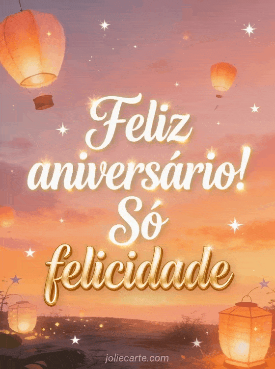 Envie uma mensagem de aniversário emocionante em uma cena poética de crepúsculo com lanternas flutuantes e estrelas cintilantes. Veja também feliz aniversário gif, buquê de flores feliz aniversário e um feliz aniversário.