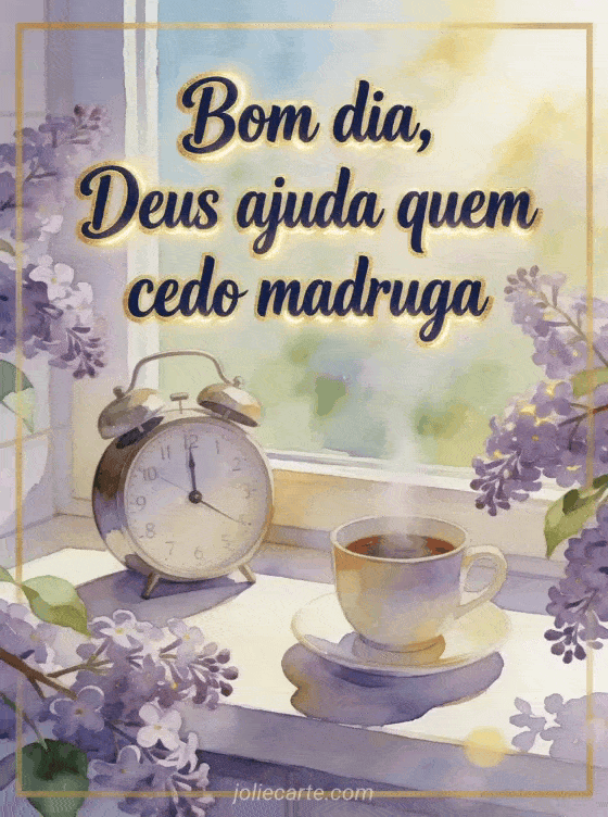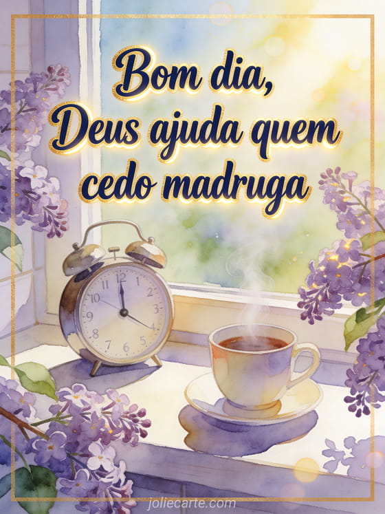 Envie uma mensagem matinal de bom dia com letras azul-marinho nítidas em aquarela, uma janela alegre de cozinha, um despertador vintage, uma xícara fumegante e ramos frescos de lilás. Veja também cartão virtual animado de bom dia, uma mensagem de bom dia para minha namorada ou cartões de bom dia gratuitos.