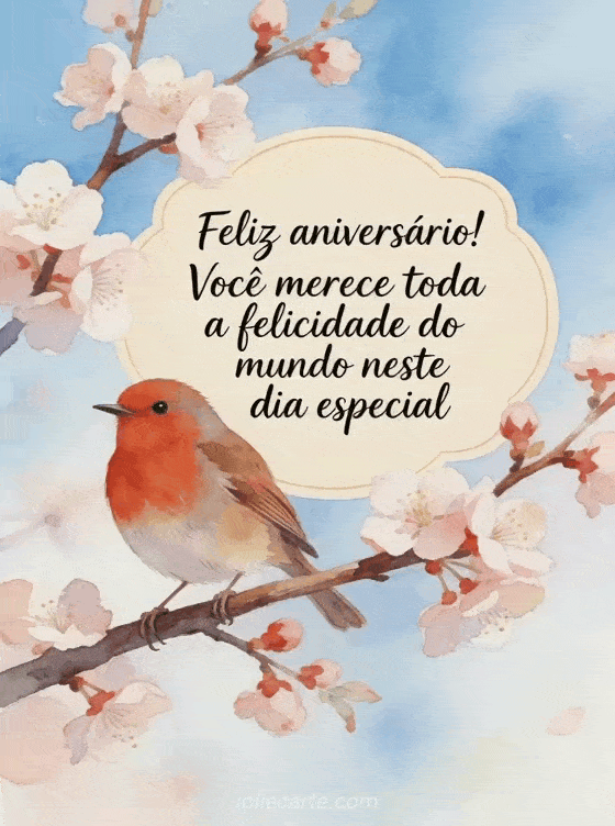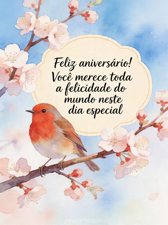 Feliz aniversário! Você merece toda a felicidade do mundo neste dia especial uma mensagem de aniversário terna com um pintarroxo e flores de primavera