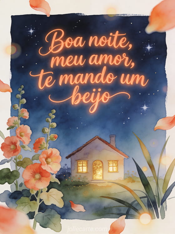 Envie uma mensagem carinhosa de boa noite com caligrafia coral, uma casinha com janelas douradas, um céu estrelado e flores de malva-rosa. Veja também um cartão para dizer boa noite, um cartão virtual animado boa noite ou um cartão animado de boa noite.