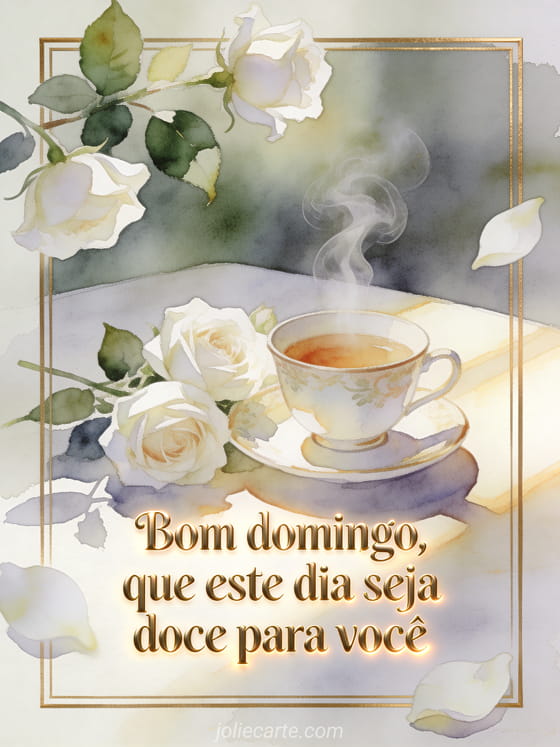 Ofereça uma mensagem suave de bom domingo com uma xícara delicada de chá, rosas brancas e luz quente em aquarela. Veja também bom domingo imagem grátis, gif de feliz domingo com sol ou feliz domingo com café imagem.