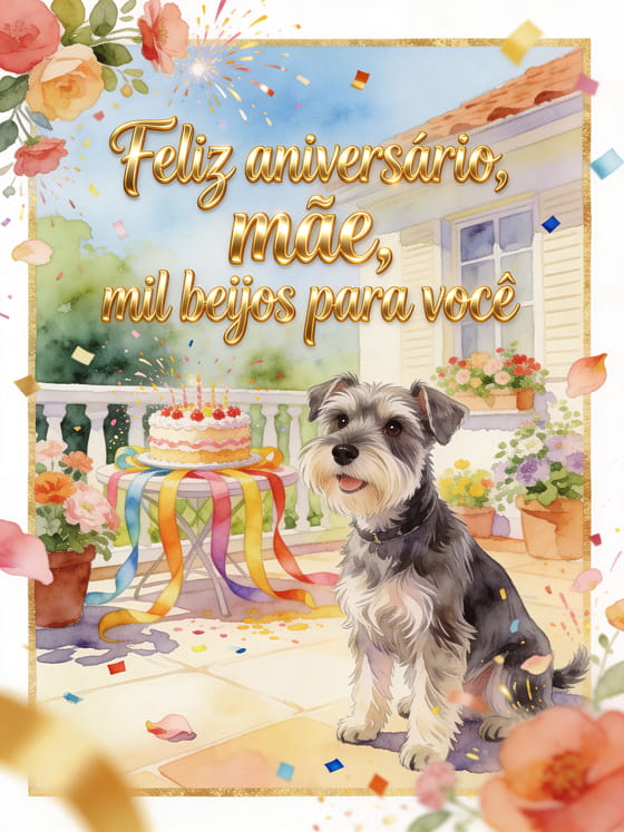 Envie à sua mãe uma mensagem alegre de aniversário com letras douradas quentes, um cão schnauzer miniatura, pétalas soltas, confete, um bolo decorado, fitas brilhantes e um pátio cheio de flores. Você também pode compartilhar um feliz aniversário mãe gif brilhante, um feliz aniversário mãe texto de aniversário ou um feliz aniversário mãe gif.