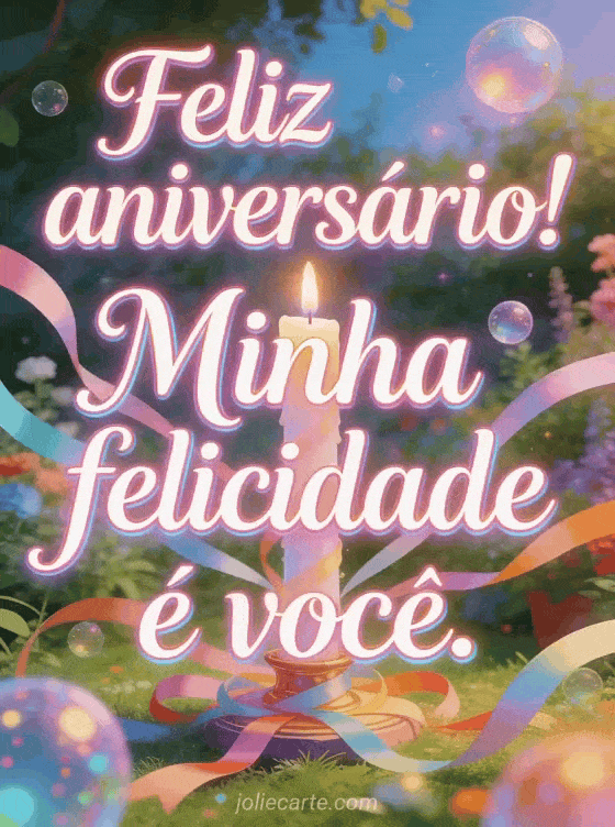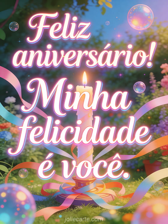 Envie uma mensagem romântica de aniversário em uma celebração de jardim dos sonhos, com uma vela iluminada, fitas, letras em neon suave e luz mágica. Personalize este cartão grátis online e compartilhe um carinho que diz que sua felicidade é essa pessoa. Veja também um cartão animado feliz aniversário meu amor, um cartão aniversário meu amor ou um feliz aniversário amor da minha vida.