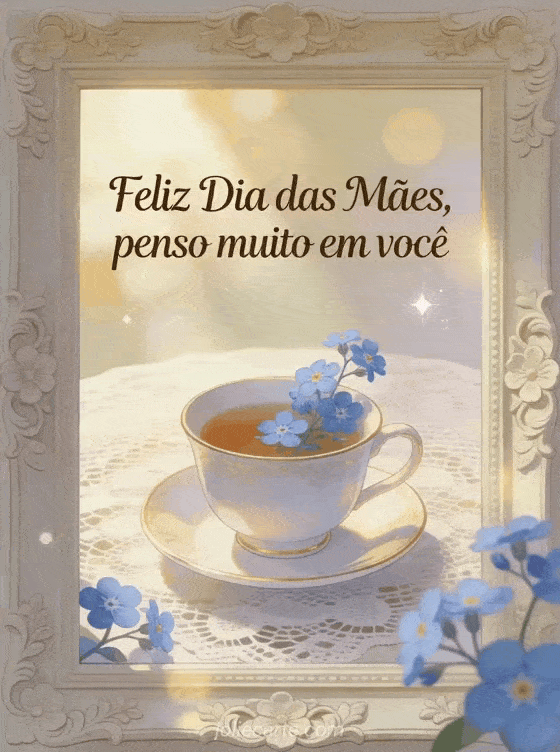 Compartilhe um cartão elegante de Dia das Mães com caligrafia creme, uma xícara de chá fotorrealista, flores azuis de miosótis, renda e uma moldura floral entalhada. Veja também uma imagem para o Dia das Mães, uma foto do Dia das Mães ou poemas Dia das Mães.