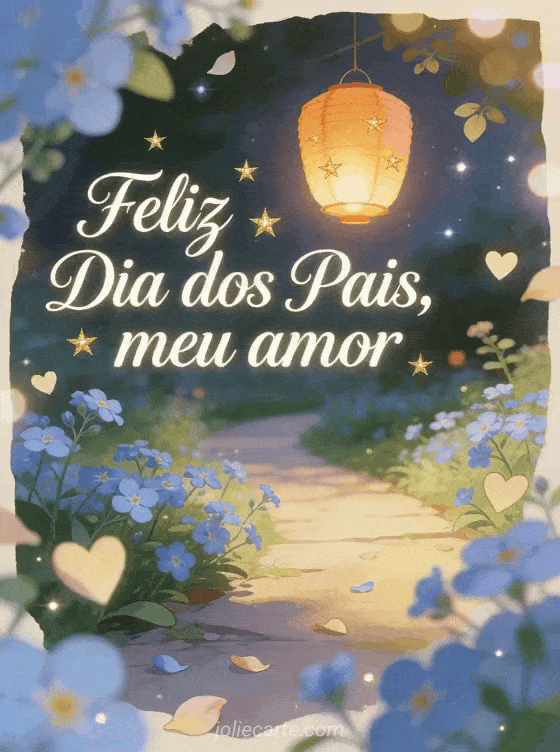 Envie uma saudação luminosa de Dia dos Pais ao seu amor com uma lanterna celeste, flores de miosótis e detalhes de coração. Você também pode enviar uma feliz Dia dos Pais imagem, um poema de amor para Dia dos Pais ou um feliz dia papai mamãe.