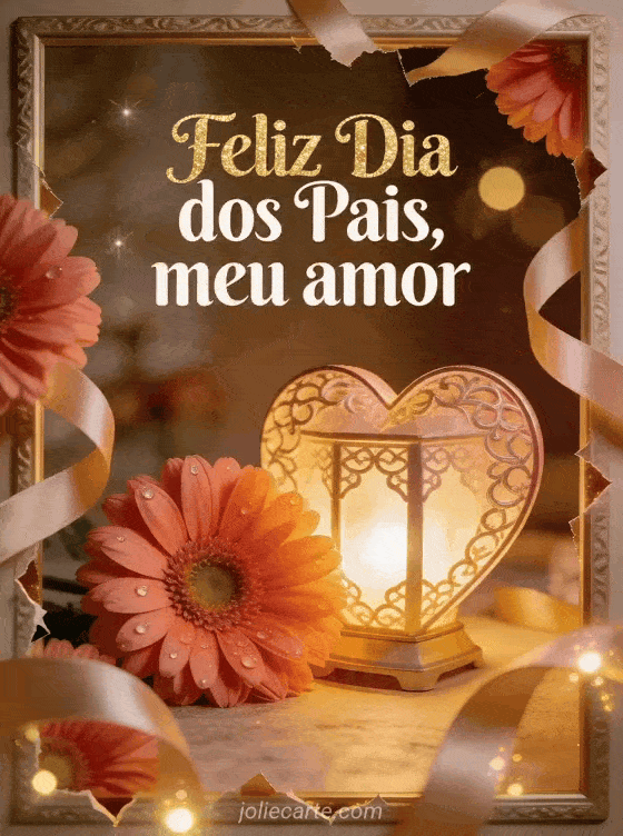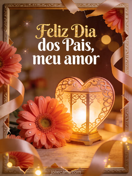 Envie uma saudação romântica de feliz Dia dos Pais meu amor com uma lanterna fotorrealista em forma de coração brilhando ao lado de gérberas coral, fitas de cetim e bokeh cintilante. Veja também feliz Dia dos Pais a todos, um cartão personalizado Dia dos Pais ou um modelo de cartão Dia dos Pais.