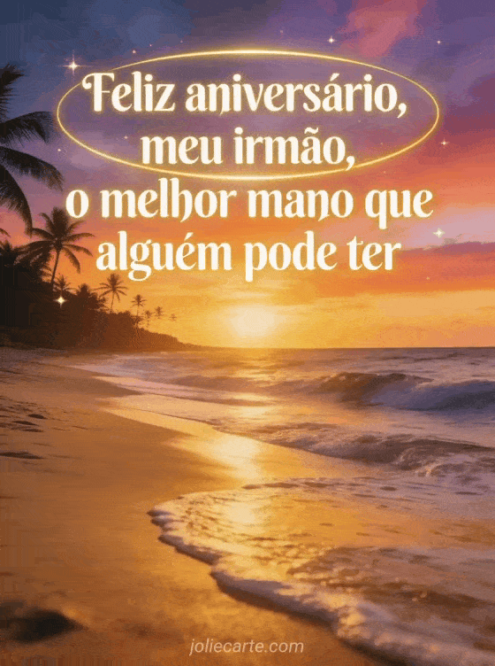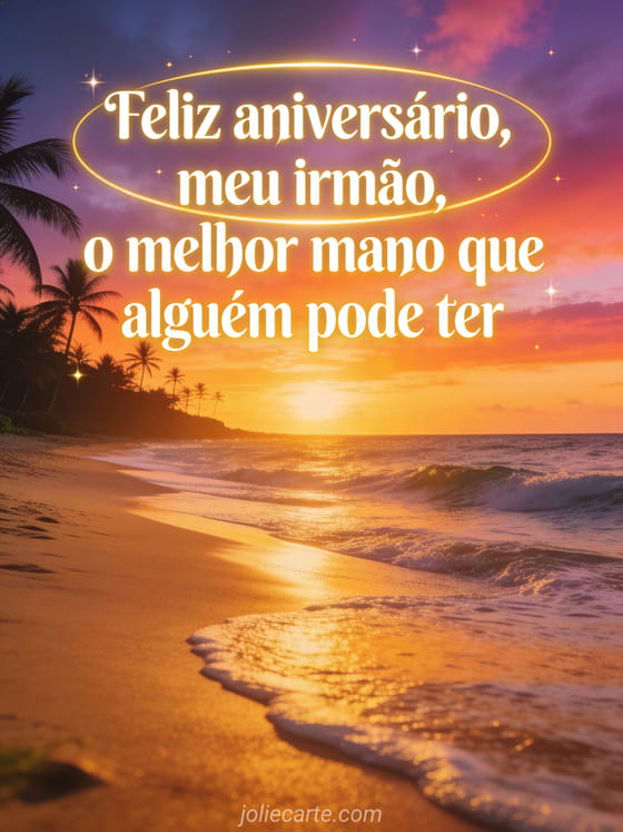 Celebre seu irmão com um pôr do sol tropical fotorrealista sobre o oceano, ondas suaves, areia dourada e silhuetas de palmeiras. Você também pode compartilhar um feliz aniversário irmãozinho, um aniversário irmãozinho ou um aniversário irmão.
