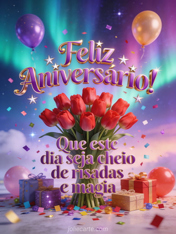 Celebre um aniversário cheio de magia com este encantador cartão de fantasia com vibrantes tulipas vermelhas cercadas de confete colorido, presentes, balões e coloridas auroras boreais dançando no céu. Descubra também um cartão de aniversário para crianças ou um cartão de aniversário para menina.