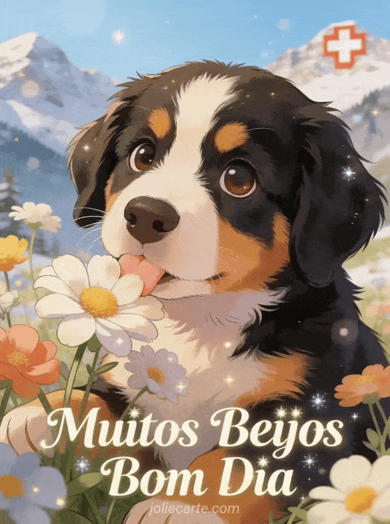 Compartilhe calor com este cartão de muitos beijos bom dia com um adorável filhote de Boiadeiro de Berna rodeado de flores alpinas nas montanhas suíças. Descubra também um cartão de bom dia meu amor bom dia ou de provérbio bom dia.