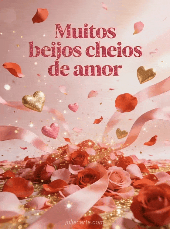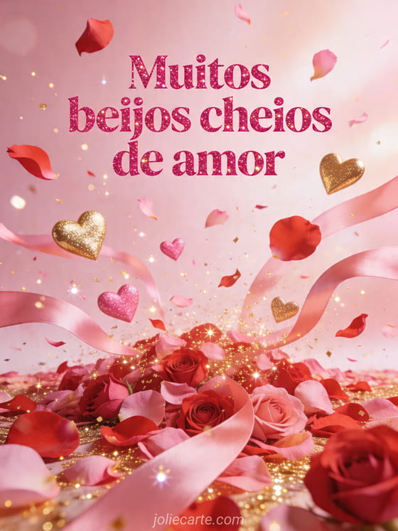 Envie uma mensagem romântica vibrante com este cartão grátis de beijos de amor cheio de pétalas de rosa, corações voando e fitas brilhantes. Veja também sonhos doces boa noite beijos eu te amo, mil beijos do coração ou beijos de amor coração coração gif.