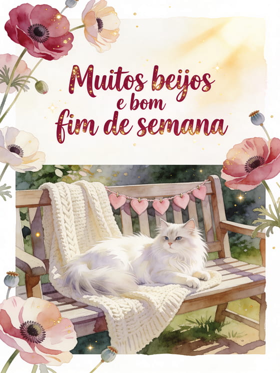 Envie muitos beijos e deseje bom fim de semana com um gato angorá turco descansando em um banco de jardim, flores de anêmona, uma manta tricotada e uma guirlanda de corações. Veja também bom fim de semana muitos beijos gif, feliz sexta-feira bom fim de semana beijos ou imagens grátis bom fim de semana beijos.