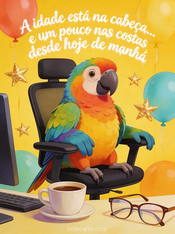 Envia este hilariante cartão de aniversário com um papagaio colorido sentado numa cadeira de escritório com caneca de café e óculos de leitura. Descobre também um cartão divertido aniversário lontra ou um cartão glamoroso aniversário gato.