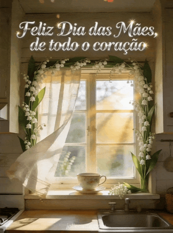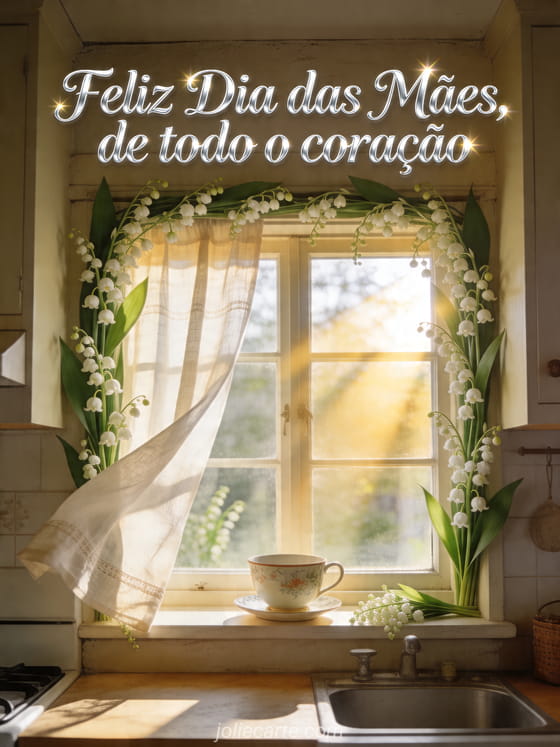 Compartilhe uma saudação tranquila com uma janela de cozinha rústica enfeitada com lírio-do-vale, uma xícara de porcelana e cortinas de linho iluminadas pelo sol. Você também pode enviar como desejar feliz Dia das Mães para sua mãe, foto de Dia das Mães ou poema de Dia das Mães.
