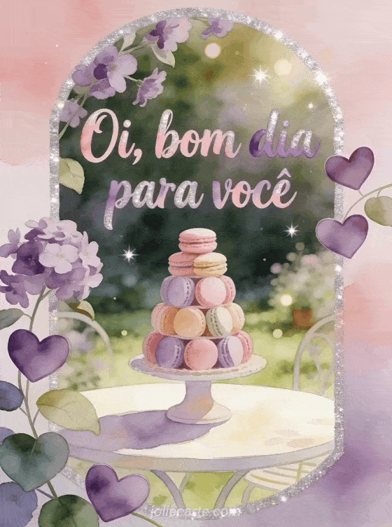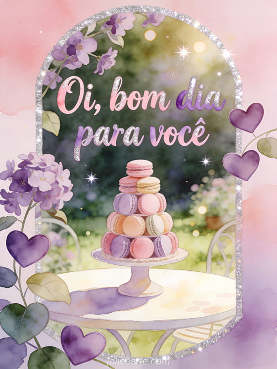 Compartilhe uma saudação delicada com violetas, folhas em forma de coração e uma torre de macarons em tons pastel sobre uma mesa de jardim luminosa. Você também pode enviar oi você beijos imagem, gatinho oi ou um doce oizinho beijos.