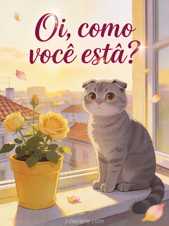 Chegue com carinho usando este cartão delicado que mostra um gato Scottish Fold cinza na janela ao lado de rosas amarelas com uma luz quente de fim de tarde. Você também pode ver oi como você está, bom dia como você está ou como você está.