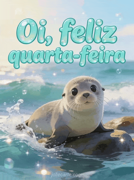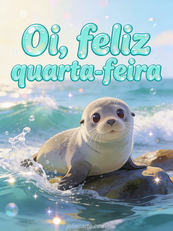 Envie uma saudação fofa de feliz quarta-feira com uma foca bebê curiosa descansando em rochas junto ao oceano, ondas salpicando e gotas de água brilhando ao sol. Veja também bom dia é quarta-feira gif, feliz quarta-feira animada ou feliz quarta-feira montanha.