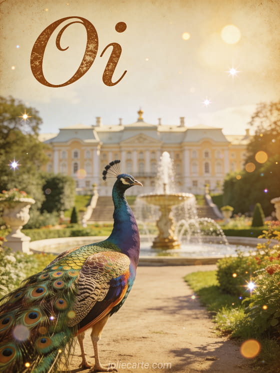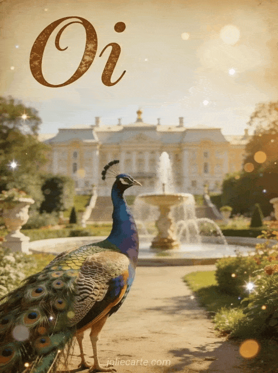 Compartilhe um lindo cartão de oi com um majestoso pavão exibindo penas coloridas em um elegante jardim com fontes. Descubra também um cartão oi bom dia humor, um cartão oi cachorro ou um cartão abelha oi.