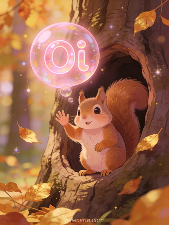 Compartilhe um alegre oi gif animado com um adorável esquilo acenando em uma floresta de outono. Descubra também um cartão oi criança ou um cartão gif oi beijos.