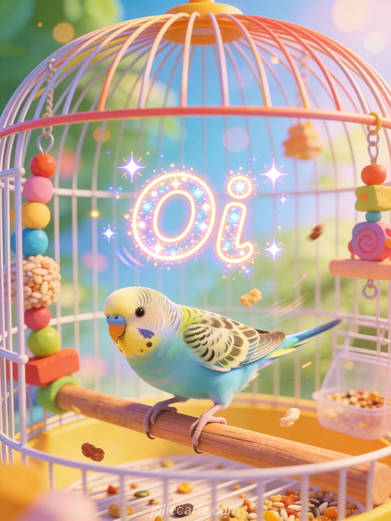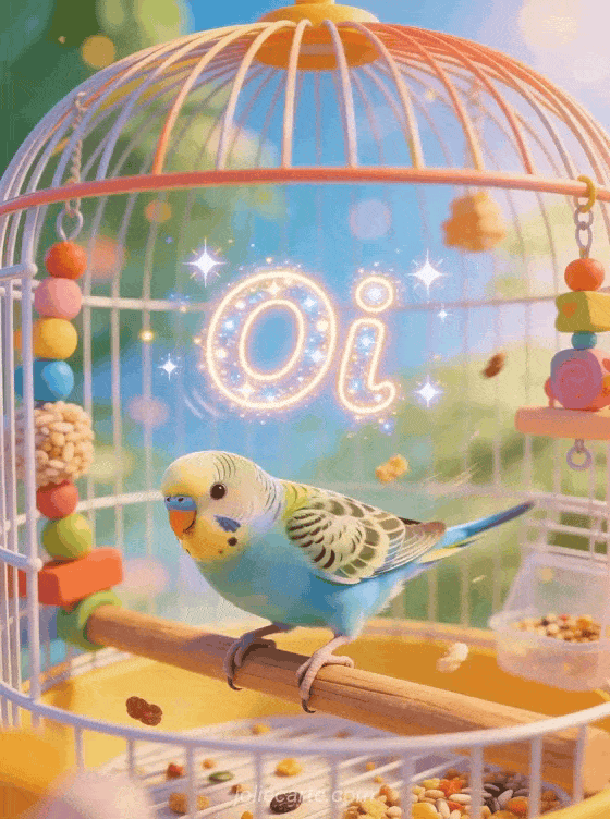 Envie este divertido gif animado de oi com um periquito saltitante na sua poleiro. Perfeito para um saludo alegre. Descubra também um cartão oi bom dia gif ou um cartão pequeno oi beijos.