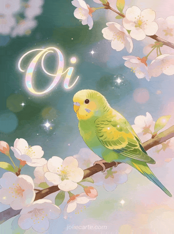 Envie um fofo oi com este cartão grátis com um periquito verde e amarelo em galhos de cerejeira florida. Descubra também um olá sol ou um olá querida.
