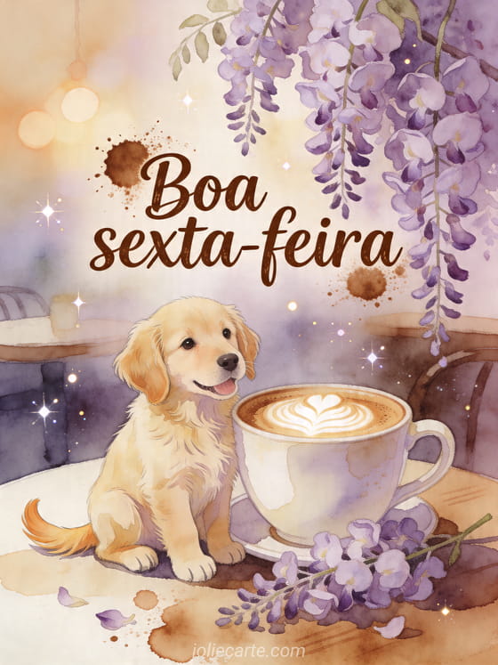 Compartilhe este caloroso cartão de boa sexta-feira com um filhote labrador, uma xícara de café e glicínias caindo. Você também pode descobrir sms boa sexta-feira e bom fim de semana, boa noite de sexta-feira e positivo olá sexta-feira.