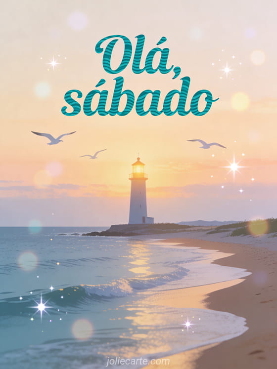Envie uma saudação serena de olá sábado com letras verde-azuladas, um farol ao amanhecer e gaivotas voando sobre uma paisagem costeira tranquila. Veja também um cartão de tenha um bom sábado, um cartão de feliz sábado com muitos beijos ou uma bela imagem de feliz sábado.