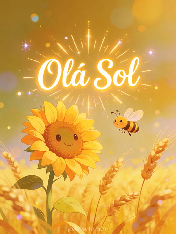 Compartilhe um lindo cartão de olá sol com um alegre girassol e uma abelha sorridente em um campo luminoso de verão com trigo dourado. Descubra também um cartão olá querida, um cartão oi fotos ou um cartão foto oi.