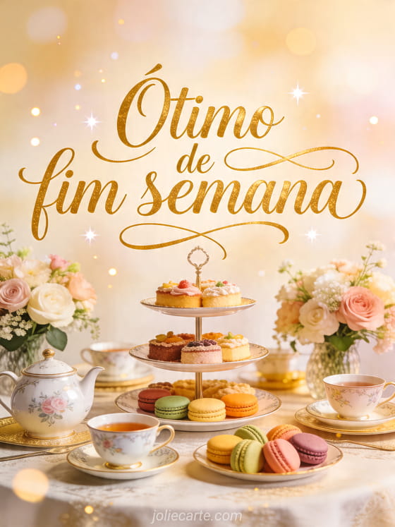 Compartilhe uma mensagem refinada de fim de semana com este cartão elegante inspirado em uma mesa de chá com flores e delicados macarons. Você também pode ver um bom fim de semana positivo, uma imagem bom fim de semana zen ou ter um bom fim de semana.