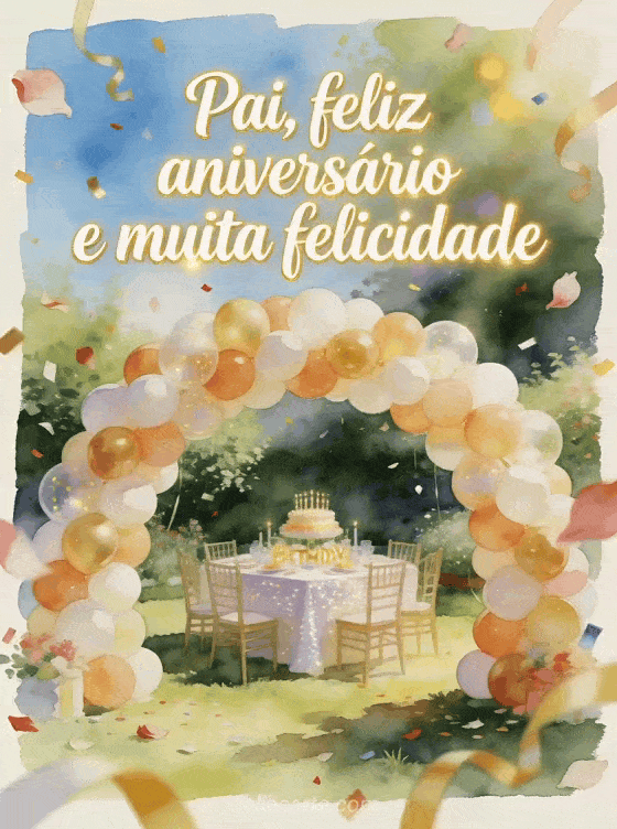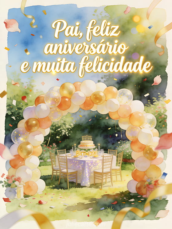 Envie pai eu te desejo um feliz aniversário com letras creme refinadas, um grande arco de balões em volta de uma mesa de aniversário brilhante em um jardim ensolarado, pétalas, fitas e confete sobre a borda. Veja também um cartão de feliz aniversário pai, um feliz aniversário papai imagens animadas ou um poema de aniversário papai criança.