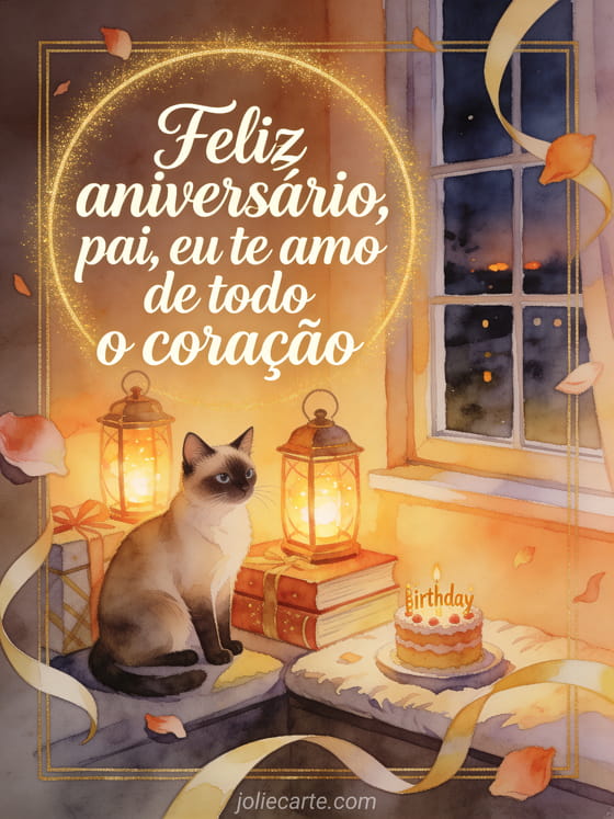 Compartilhe um texto emocionante de aniversário para o pai com um gato siamês ao lado de lanternas brilhantes, livros embrulhados e um pequeno bolo de aniversário em um assento aconchegante na janela. Você também pode enviar feliz aniversário pai texto, feliz aniversário pai simples ou feliz aniversário pai coração.