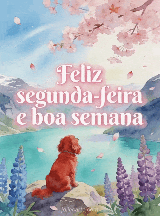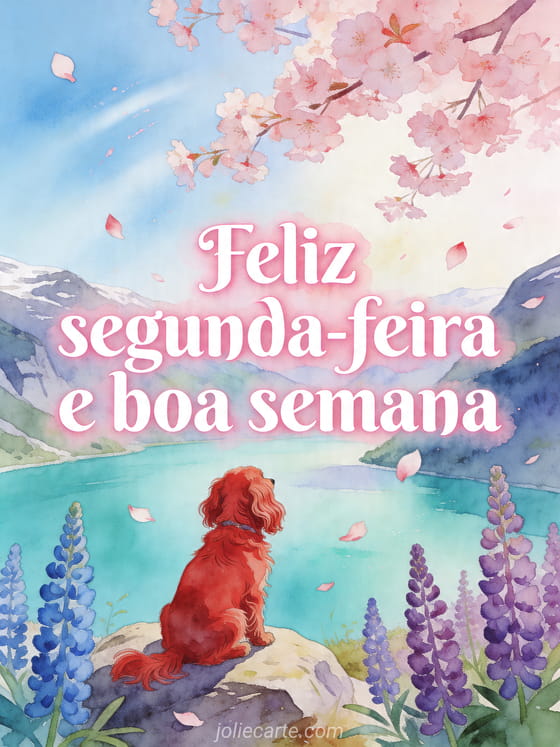 Envie uma sonhadora mensagem de segunda-feira e boa semana com este cartão ilustrado de cerejeiras em flor, um fiorde turquesa, tremoços e um cocker inglês. Você também pode descobrir feliz segunda-feira e boa semana de inverno, desejar uma feliz segunda-feira e uma boa semana ou bom dia feliz segunda-feira bom dia boa semana.