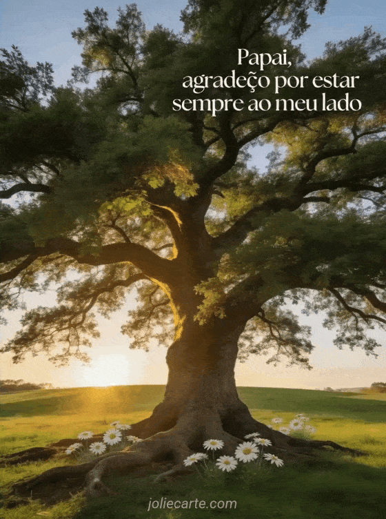 Compartilhe palavras carinhosas de Dia dos Pais com uma imagem serena de um carvalho centenário em uma campina verde, luz dourada do fim do dia e margaridas aos seus pés. Você também pode descobrir uma citação curta de Dia dos Pais, feliz dia dos pais papai querido ou um feliz Dia dos Pais papai texto emocionante.